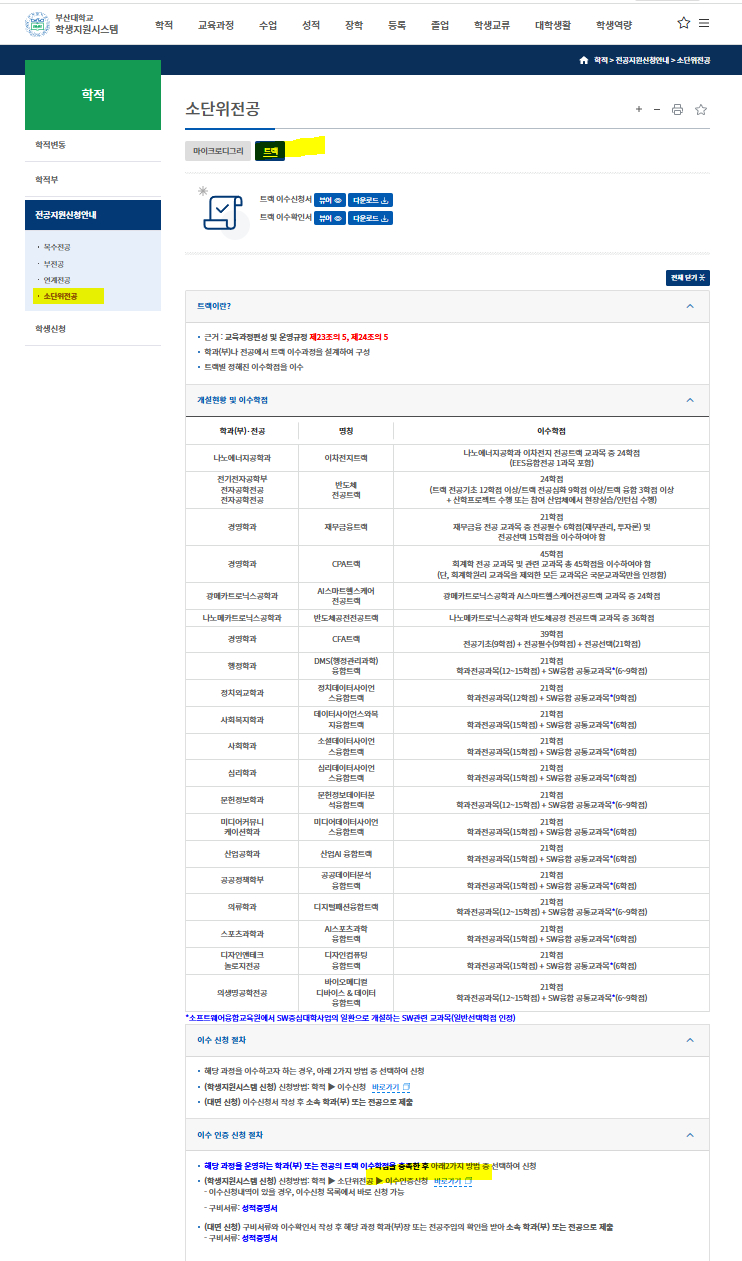 <그림1> 학생지원시스템 로긴-> 학적-> 전공지원신청안내: 소단위전공-> 트랙 or 마이크로디그리 -> 이수인증신청 바로가기
