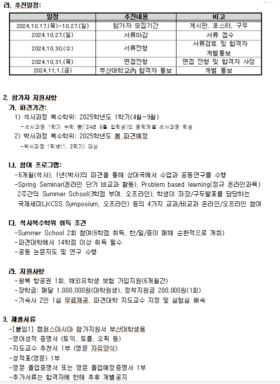 fnctId=bbs,fnctNo=2651 작성일 2024.10.17 수정일 2024.10.17 작성자 김인경 조회수 524 [캠퍼스아시아(에너지환경)] 2025년 상반기 복수학위 신입생 모집 첨부파일 2025 캠퍼스아시아 참가지원서 부산대학생용.hwp 미리보기 CAMPUS Asia 2025학년도 복수학위 참가자 모집 공고(안).hwp 미리보기
