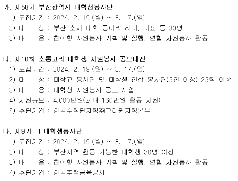 fnctId=bbs,fnctNo=2655 작성일 2024.03.11 수정일 2024.03.11 작성자 김인경 조회수 389 [부산광역시자원봉사센터] 대학생 자원봉사 활동 모집 안내 * 기타문의: 부산광역시자원봉사센터 홈페이지(www.busan1365.kr) 참 첨부파일 제58기 대학생봉사단 모집 웹포스터.jpg 미리보기 소통고리 대학생 자원봉사 웹 포스터.png 미리보기 HF대학생 봉사단 모집.png 미리보기